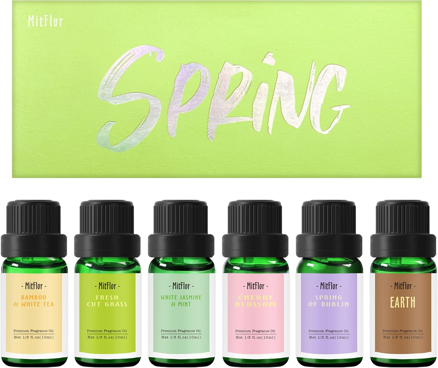 This MitFlor spring fragrance oils set includes a series of premium scented oils from lovely spring florals, to light and airy, clean fragrances; oils include Spring of Dublin, White Jasmine & Mint, Bamboo & White Tea, Earth, Fresh Cut Grass, and Cherry Blossom