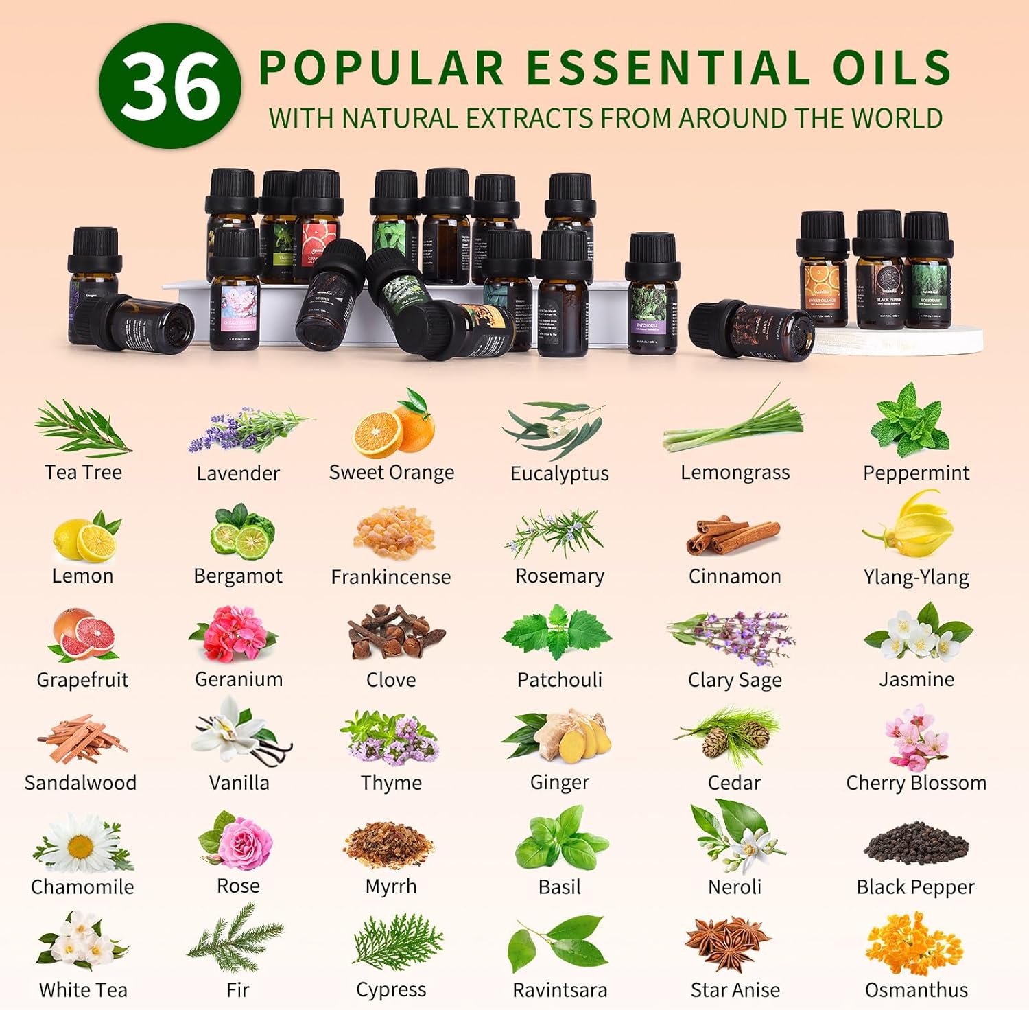36x5ML Essential Oils Set: This essential oil set includes some of the most popular and in demand essential oils – Peppermint, Lavender, Eucalyptus, Tea Tree, Sweet Orange, Lemon, Lemongrass, Bergamot, Frankincense, Patchouli, Rosemary, Cinnamon, Cedar, Jasmine, Clove, Ylang-Ylang, Grapefruit, Geranium, Clary Sage, Sandalwood, Vanilla, Thyme, Ginger, Cherry Blossom, Chamomile, Rose, Myrrh, Basil, Neroli, Black Pepper, White Tea, Fir, Cypress, Ravintsara, Star Anise, Osmanthus Oils