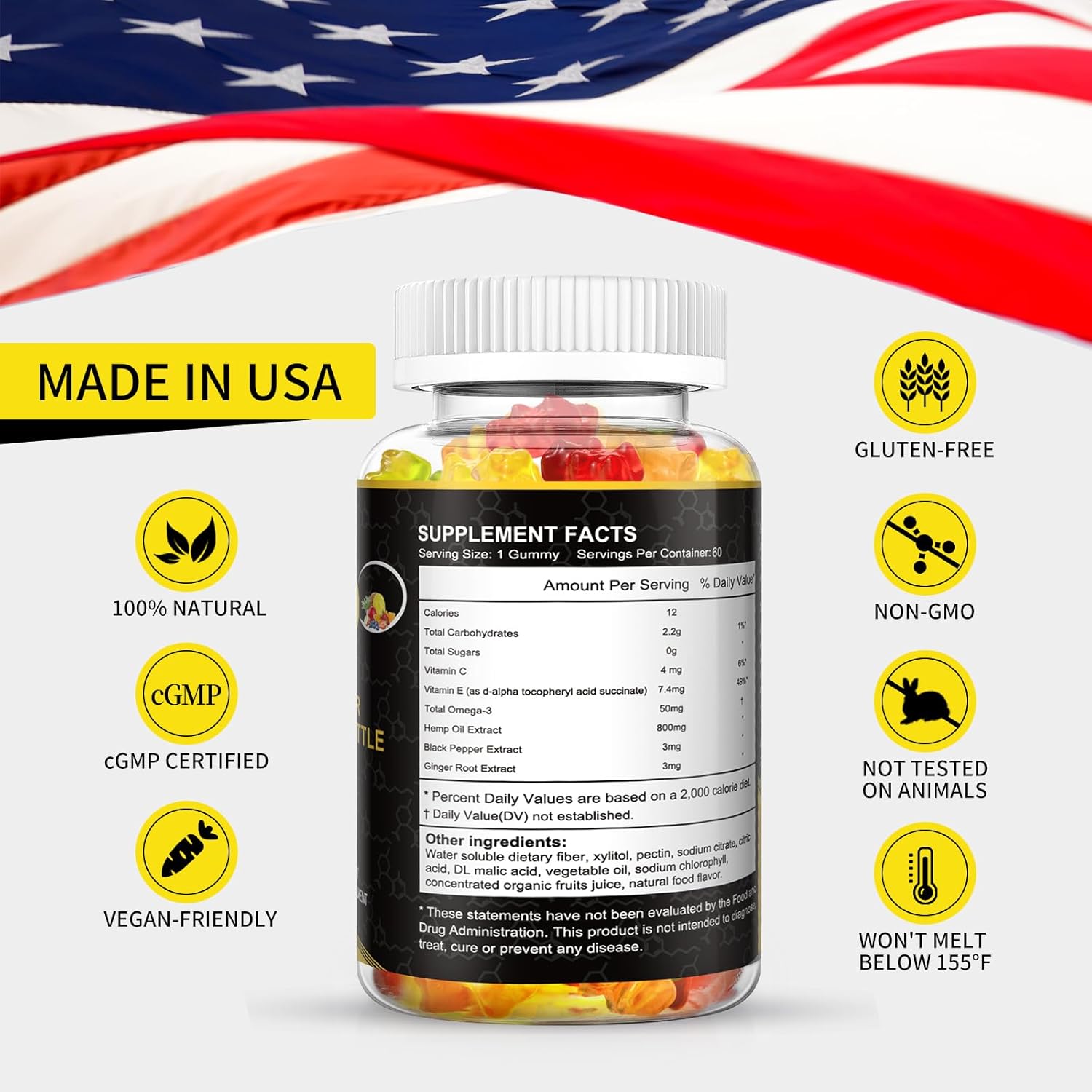 – Experience improved happiness, balanced hormones, and relaxation with just one gummy a day. Our formula, infused with 15,000mg of organic USA-grown hemp oil extract per bottle, offers a natural boost.
