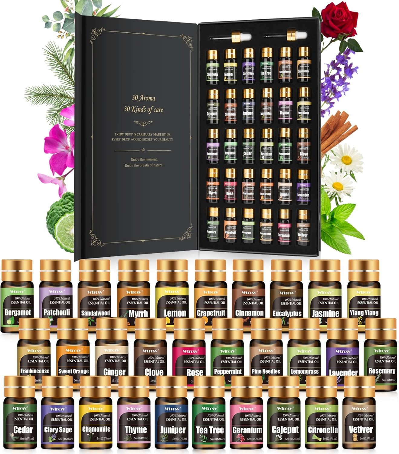 Essential Oils Set: Citronella, Chamomile, Patchouli, Sandalwood, Myrrh ,Cinnamon, Lemon, Eucalyptus, Bergamot, Lavender, Thyme, Jasmine, Cedar,Lemongrass,Peppermint,Clove, Sweet Orange,Grapefruit, Ginger, Vetiver, Rosemary, Juniper,Rose, Tea tree