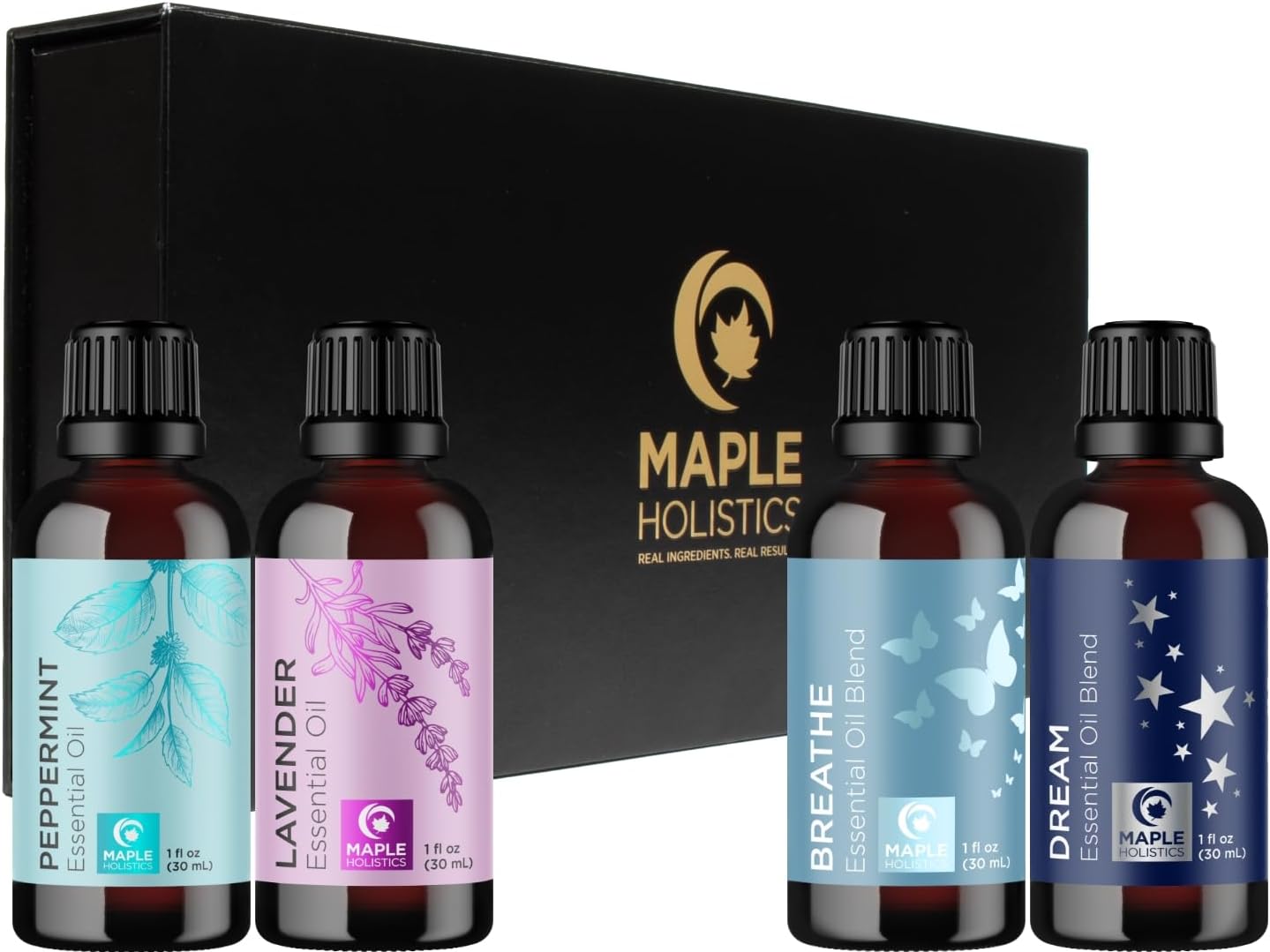 Unique Essential Oils Set for Diffusers - Try our combo oil diffuser essential oil set with large bottles of peppermint and lavender essential oil plus Dream and Breathe aromatherapy diffuser oils